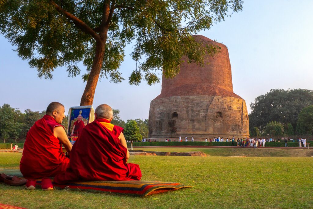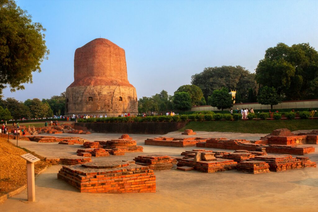 The first stop is the famous Dhamek Stupa, a massive stone structure marking the exact place where Lord Buddha gave his first teaching to his disciples.